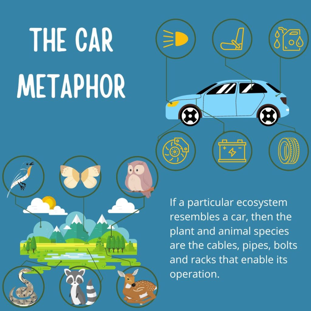As a metaphor, if a particular ecosystem resembles a car, then the plant and animal species are the cables, pipes, bolts and racks that enable its operation.