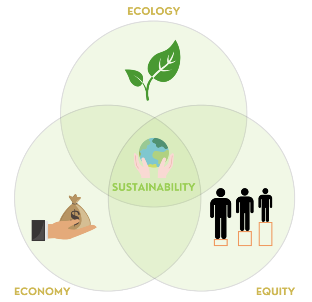 The 3 ‘Es of sustainability are Economy, Ecology and Equity. To achieve sustainable development, we need to find a balance between the three Es of sustainability. This means that sustainability is achieved when your actions are helping to develop the economy, promoting social equity, and protecting the integrity of the environment for future generations.